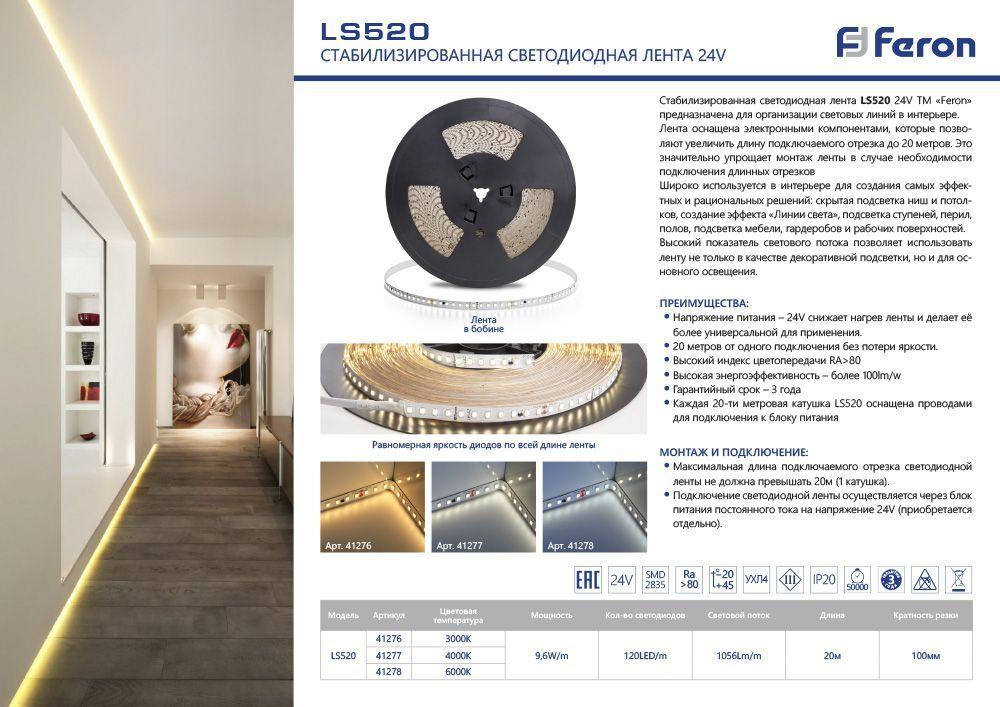 Характеристики Светодиодная лента Feron 9,6W/m 120LED/m 2835SMD теплый белый 20M LS520 41276