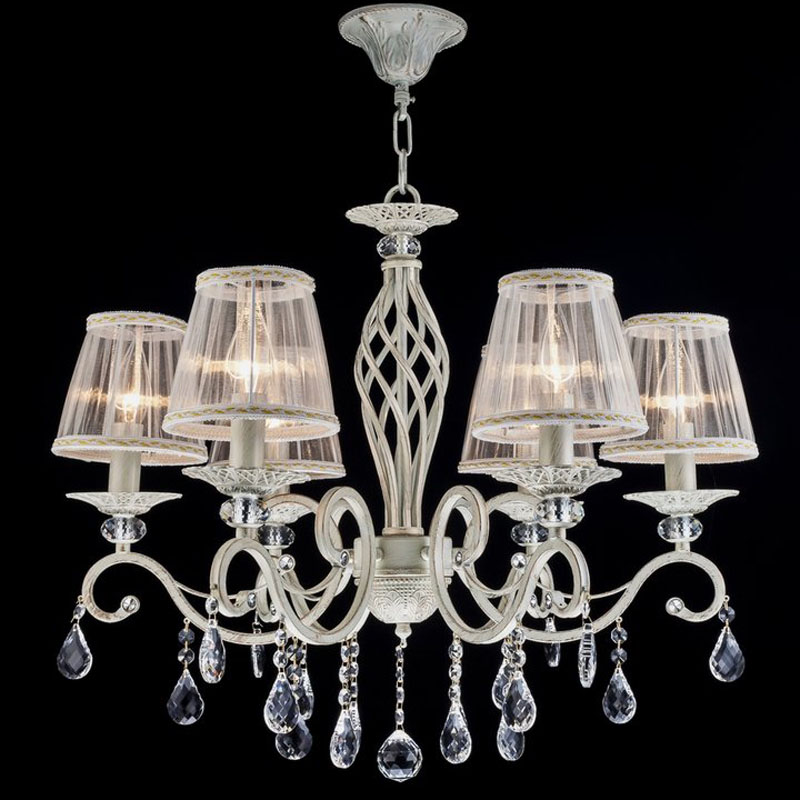Этот осветительный прибор подвесить в интерьере в стиле прованс и классика. Каркас из металла, цвет белый, подвески прозрачные, плафоны белые из текстиля. Светильник имеет защиту от воды IP20.