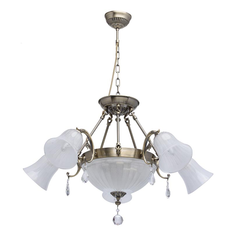 Осветительный прибор отлично подвесить в комнате, выдержанном в стилистике классика. Основание из металла, цвет бронзовый, подвески прозрачные, плафоны белые из стекла. Светильник имеет защиту IP20.