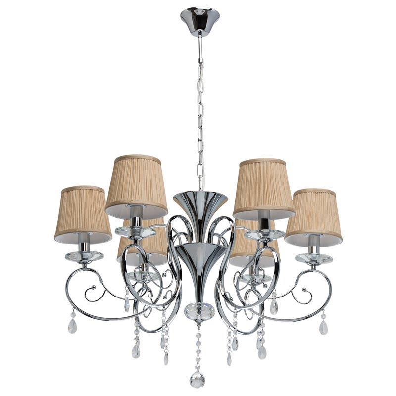Данную люстру оптимально подвесить в помещении, выдержанном в стилистике классика и кантри. Основание из металла, цвет хромированный, подвески прозрачные, плафоны бежевые из текстиля. Светильник обладает степенью защиты от воды IP20.